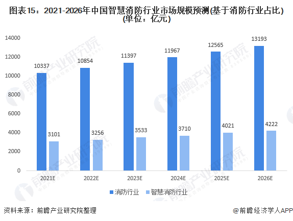 据前瞻产业研究院数据显示,预计2026年中国消防行业市场规模将达到13193亿元,2021~2026年智慧消防行业渗透率预计达到30%以上。据此,预计到2026年,我国智慧消防系统市场规模将达到4222亿元。市场潜力巨大,发展前景广阔!
